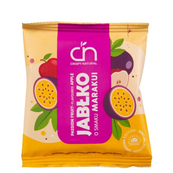 Jabłko o smaku marakui – Egzotyczna przekąska z polskich sadówOdkryj zupełnie nową, tropikalną odsłonę swoich ulubionych owoców dzięki chrupiącym plasterkom jabłek z polskich sadów wzbogaconych sokiem z marakui. To niezwykłe połączenie przeniesie Cię prosto w tropiki, oferując orzeźwiający smak dojrzewających w słońcu owoców w formie lekkiej i poręcznej przekąski. Dzięki zastosowaniu innowacyjnej technologii suszenia produkt zachowuje wysokie wartości odżywcze oraz naturalnie wysoką zawartość błonnika pokarmowego, pozostając przy tym propozycją w pełni bezglutenową oraz odpowiednią dla wegan i wegetarian.