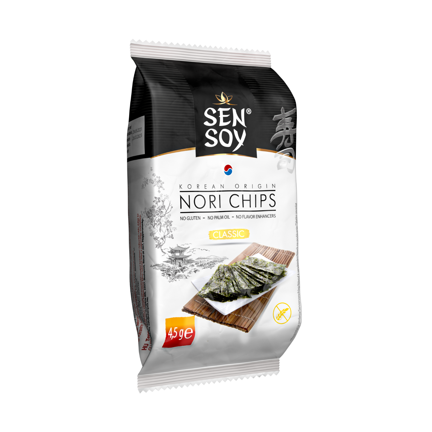 Chrupiące Chipsy nori Klasyczne- oprószone solą i prażone z dodatkiem oleju sezamowego. Ta naturalna, azjatycka przekąska sprawdzi się jako smaczny i wartościowy zamiennik dla tłustych chipsów i innych niezdrowych przekąsek. Nori kryje w sobie źródło dobroczynnych składników, takich jak witamina B12, błonnik, żelazo, szereg aminokwasów oraz odżywcze tłuszcze omega-3. Produkt nie zawiera: glutenu, oleju palmowego oraz sztucznych dodatków, wzmacniaczy smaku i barwników.