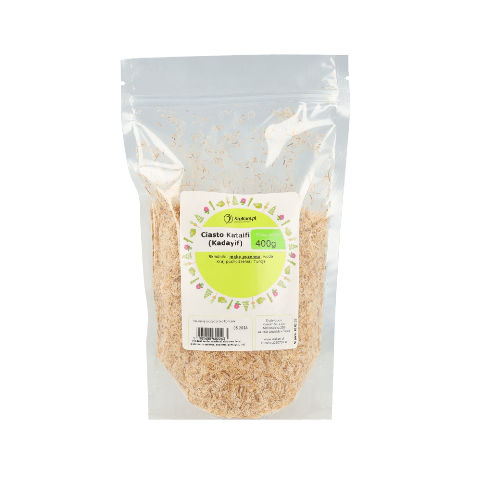 Ciasto Kataifi to wyjątkowy produkt cukierniczy, charakteryzujący się delikatnymi, cienkimi nitkami ciasta. Jego lekka i chrupiąca struktura sprawia, że doskonale sprawdza się w wielu deserach i daniach wytrawnych. Ciasto powstaje wyłącznie z mąki pszennej i wody, bez konserwantów, co gwarantuje naturalny smak i najwyższą jakość. Jest to jeden ze składników viralowej czekolady dubajskiej.