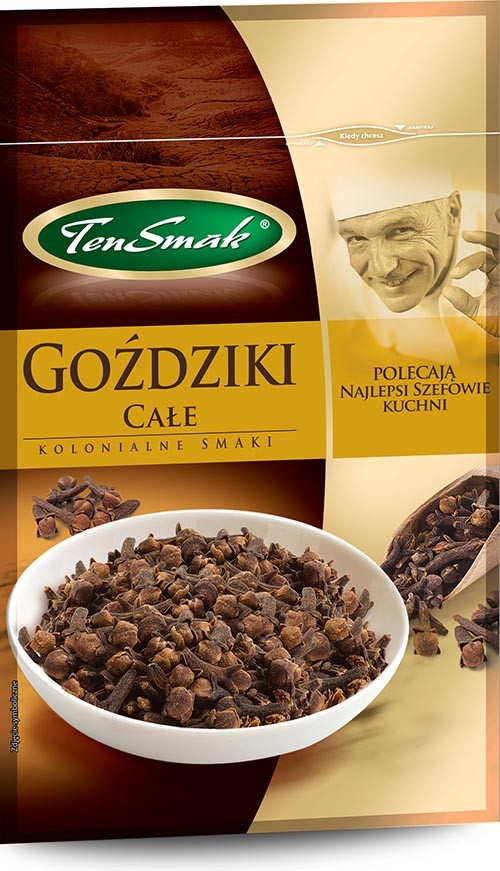 Goździki całe Ten Smak zostały umieszczone w opakowaniu z zamknięciem strunowym. Pomaga to zachować świeżość i aromat na dłużej. Goździki to suszone pąki kwiatowe tropikalnego drzewa. Mają korzenny aromat i nieco palący smak. Goździkami przyprawia się pierniki, kompoty, marynaty oraz grzane piwo i wino.