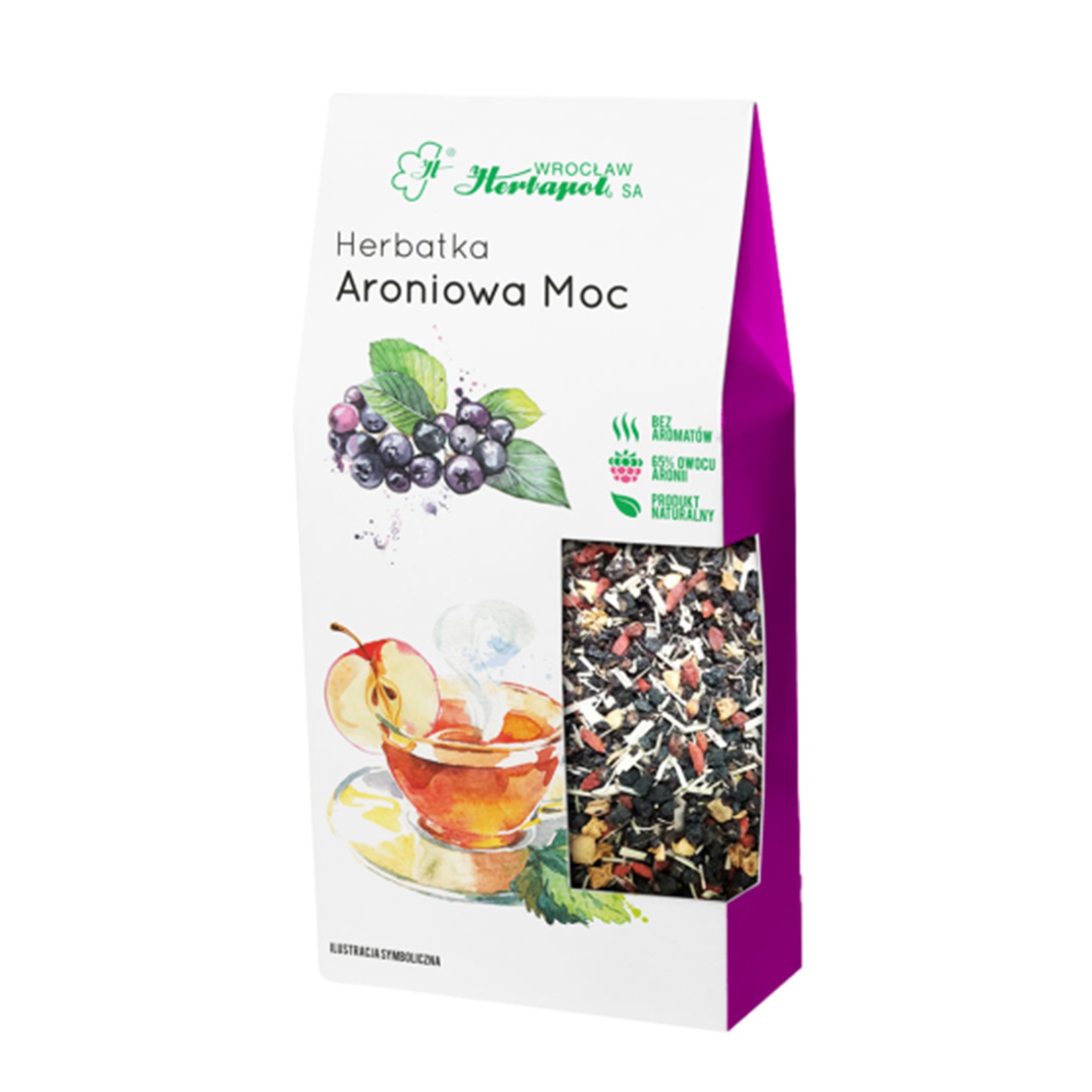 Herbatka Aroniowa Moc zawiera w swoim składzie, aż 65% wysuszonego owocu aronii. Pełnię smaku i aromatu zapewniają doskonale dobrane pozostałe składniki, a mianowicie : owoc czarnej porzeczki, owoc jabłoni domowej, jagody goji oraz trawa cytrynowa, a dodatkowo surowce z których skomponowana została herbatka rozdrobnione są w taki sposób, aby spełniały oczekiwana wielbicieli herbatek sypanych z dużymi kawałkami owoców.