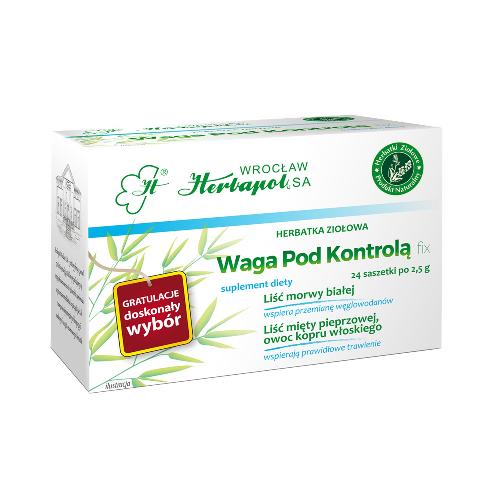 Herbatka Waga Pod Kontrolą to nasza propozycja dla osób dbających o linię. Zastosowane składniki odpowiadają za jej wspomagające działanie: • liść morwy białej korzystnie wpływa na przemianę węglowodanów, • liść mięty pieprzowej i owoc kopru włoskiego wspierają prawidłowe trawienie.