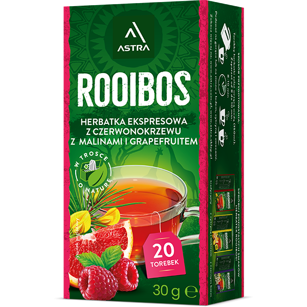 Krzew Rooibos (łac. Aspalathus linearis) uprawiany jest na terenach Republiki Południowej Afryki. Jego unikalne właściwości – brak kofeiny oraz garbników – sprawiają, że zyskuje coraz większe grono wielbicieli.Dodatek malin i grapefruita dodaje tej herbacie niesamowitego aromatu.W trosce o naturę, herbata Rooibos została zamknięta w nowym opakowaniu! Kartonik nie zawiera foliowej owijki, a torebka nie posiada metalowej zszywki. Herbaciane torebki wykonane są na bazie materiałów pochodzenia roślinnego.Idealna na prezent dla osoby, która kocha herbatę.