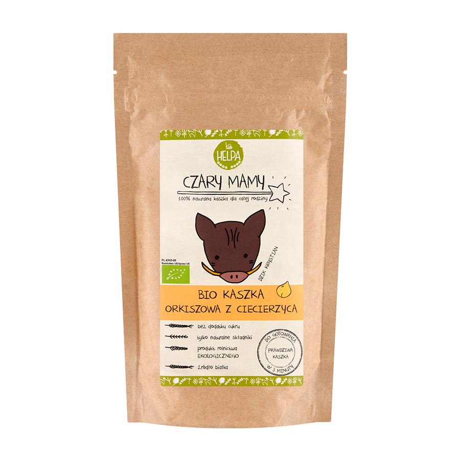 BIO KASZKA ORKISZOWA Z CIECIERZYCĄ CZARY MAMY Kaszka z dodatkiem ciecierzycy to świetne źródło białka. Może stać się bazą do pełnowartościowego, wegańskiego posiłku. Ugotowana kaszka ma konsystencję delikatnego puddingu i może być podana zarówno na słodko, jak i na słono. Strączki warto wprowadzać do diety już od najmłodszych lat, gdyż są nie tylko dobrym roślinnym źródłem białka, ale również wielu cennych składników mineralnych. Smak ciecierzycy jest delikatnie wyczuwalny, główną nutą są dobrze znane smaki zbożowe. Kaszki ze strączkami to wyjątkowa nowość na rynku. Tego jeszcze nie było! To kaszki pełne nowych mocy! Dobrze znane ekologiczne kaszki do gotowania z dodatkiem soczewicy i ciecierzycy to bogate w białko produkty, które mogą stać się bazą do pełnowartościowego, wegańskiego posiłku. Nasiona roślin strączkowych to bogactwo białka, błonnika i składników mineralnych. Warto zadbać o to, by były elementem urozmaiconej diety już od najmłodszych lat. Nowe kaszki mogą ułatwić zapoznanie się ze strączkami małym smakoszom. Połączenie kaszek ze strączkami to wygoda dla rodzica i znana, przyjemna konsystencja dla dziecka. Oprócz tego, można z pomocą kaszek ze strączkami stworzyć wiele ciekawych dań. Nadadzą się świetnie jako baza naleśników, gofrów czy placków. Kaszka nie jest produktem specjalnego przeznaczenia żywieniowego
