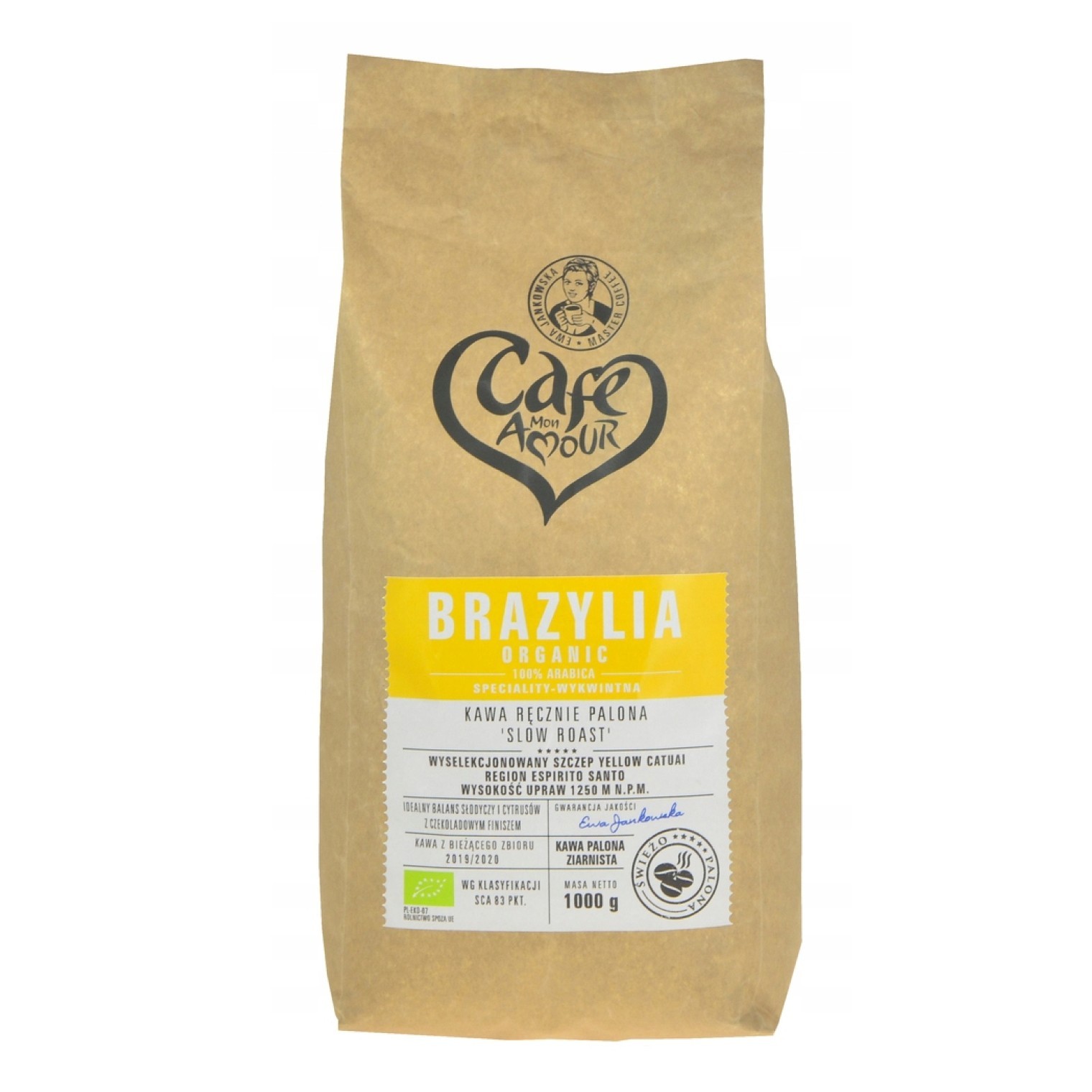 Czy wiesz, dlaczego kawa Brazylia Organic to wyjątkowy produkt? W brazylijskim mieście Pedra Azul ma miejsce biodynamiczny proces uprawy roślin, który odbywa się ze szczególną troską o ochronę całego ekosystemu. Wszystko rozwija się zgodnie z fazami słońca i księżyca, kontrolowanymi przez zaprojektowany kalendarz biodynamiczny. Nie bez znaczenia jest również lokalizacja poszczególnych upraw – muszą się one wzajemnie stymulować dlatego ich położenie obok siebie (lub w oddaleniu) nigdy nie jest przypadkowe. Kawa Brazylia Organic 250 g pochodzi właśnie stamtąd! Klimat panujący w rejonie Espirito Santos, uznany został przez ONZ za jeden z trzech najlepszych na świecie. Kawowiec odmiany Arabica szczepu Yellow Catuai rozwija się więc w doskonałym środowisku, dzięki któremu palona kawa Brazylia Organic zaskakuje smakiem.Składają się na niego połączenia:słodyczy i cytrusów, orzechów i migdałów, aromatów czekolady. Stopień upału – średnio mocny (tzw. Full City). Cielistość – średnia. Klasyfikacja wg SCA 83 punkty