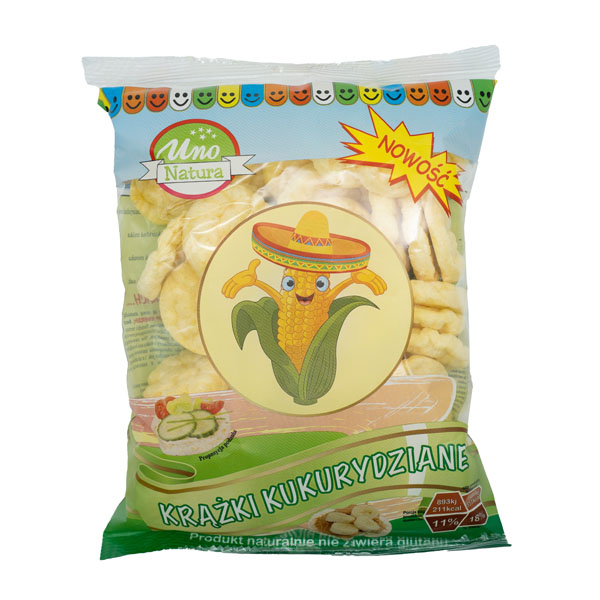 KRĄŻKI KUKURYDZIANE PRODUKOWANE SĄ NOWĄ METODĄ: POLEGAJĄCĄ NA PRAŻENIU GORĄCYM POWIETRZEM,M BEZ DODATKU TŁUSZCZU, NIEPIECZONE, NIESMAŻONE
