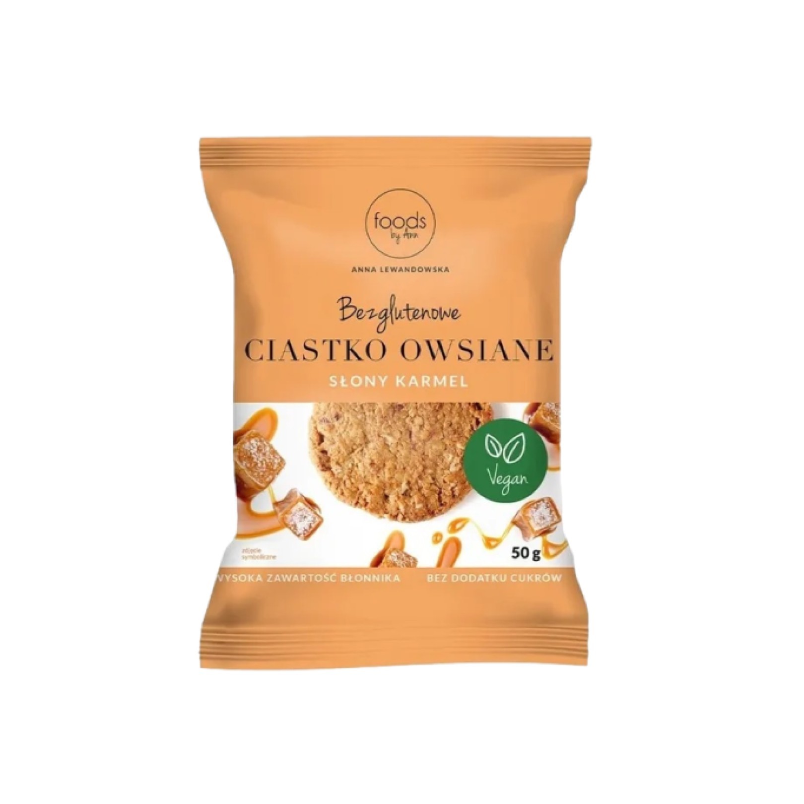 Bezglutenowe ciastko owsiane na bazie orzechów orachidowych, z masłem orzechowym i słonym karmelem.