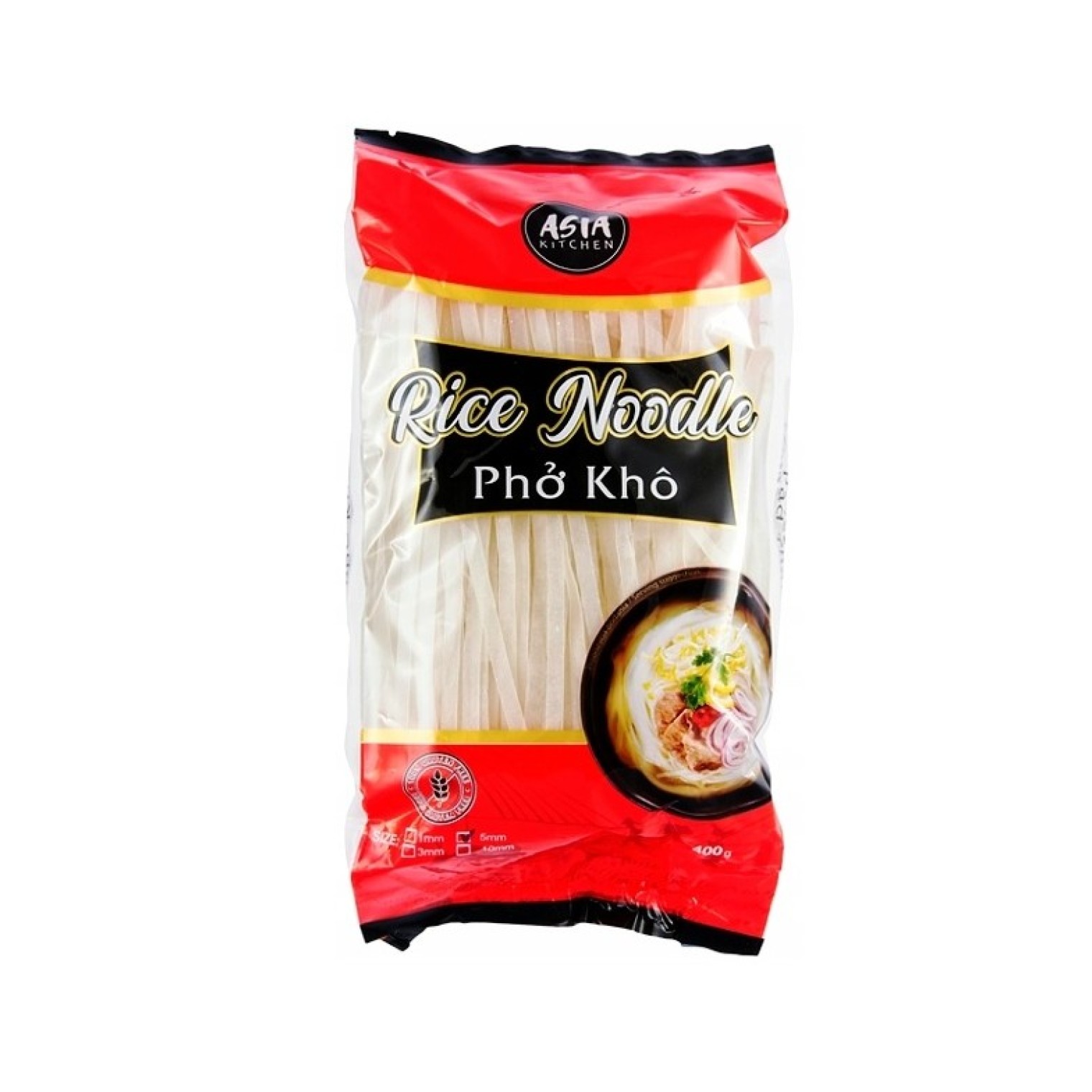 Wietnamski makaron ryżowy w postaci szerszych wstążek 5 mm marki Asia Kitchen.