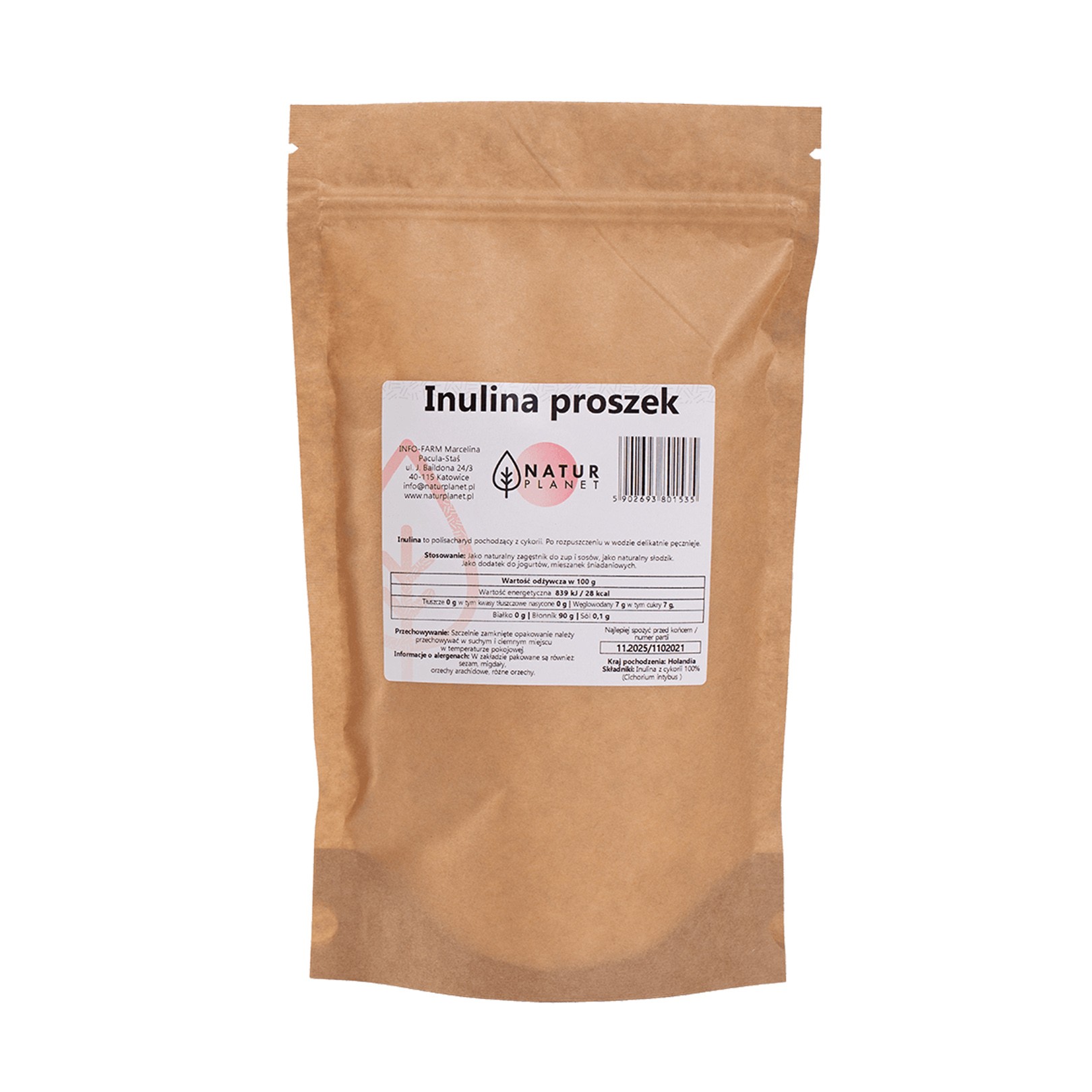 Inulina, to polisacharyd pochodzący z cykorii, który po rozpuszczeniu w wodzie delikatnie pęcznieje. Produkt jest zapakowany w torebkę papierową z wkładem poliestrowym ze struną.