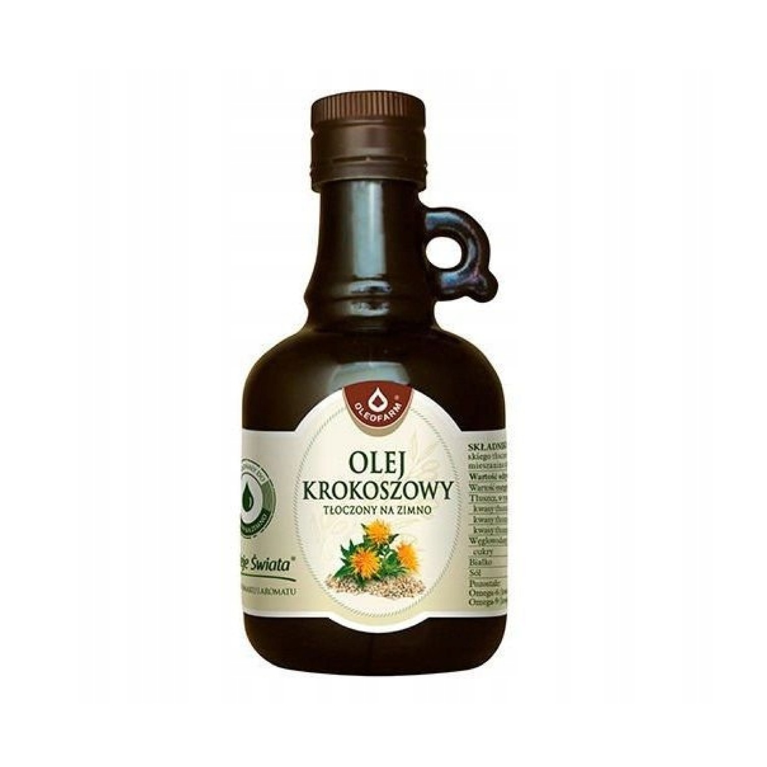 Olej krokoszowy to pozyskiwany metodą tłoczenia na zimno nasion krokosza barwierskiego złocisty płyn o delikatnym, orzechowym smaku. Prawdziwe bogactwo nienasyconych kwasów tłuszczowych, minerałów, witamin i związków czynnych o niezwykle korzystnym działaniu na organizm człowieka. Znany i ceniony już w starożytności, ponownie odkryty przez miłośników naturalnej diety i medycyny oraz ekologicznej kuchni, dziś wraca na nasze stoły. Na tle większości tłuszczów olej z krokosza wprost błyszczy jako olej najhojniej obdarowany przez naturę ilością kwasu linolowego oraz witaminy E. Wzmacnia układ sercowo-naczyniowy, poprawia urodę i zaskakująco dobrze sprawdza się w walce z nadwagą.