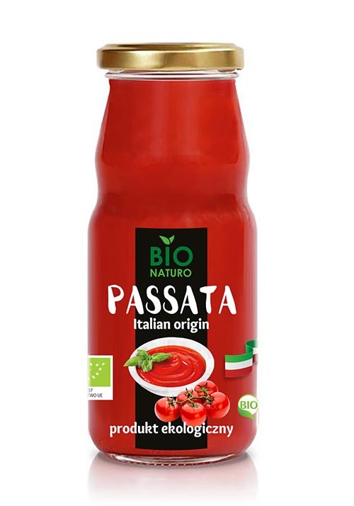 Passata pomidorowa firmy Bionaturo to włoski produkt powstały z przetartych pomidorów. Jest podstawowym składnikiem kuchni włoskiej. Można z niej przygotować pyszny sos pomidorowy do spaghetti, lasagne czy pizzy. Używa się jej do innych makaronów, zapiekanek oraz mięs i warzyw. Passata pomidorowa stanowi doskonałą bazę dla innych sosów, np. z dodatkiem warzyw (bakłażan, cukinia, papryka) i aromatycznych świeżych ziół (bazylia, rozmaryn i tymianek). Posiada niezwykły pomidorowy smak oraz gęstą i kremową konsystencję. Passata firmy Bionaturo jest produktem ekologicznym.