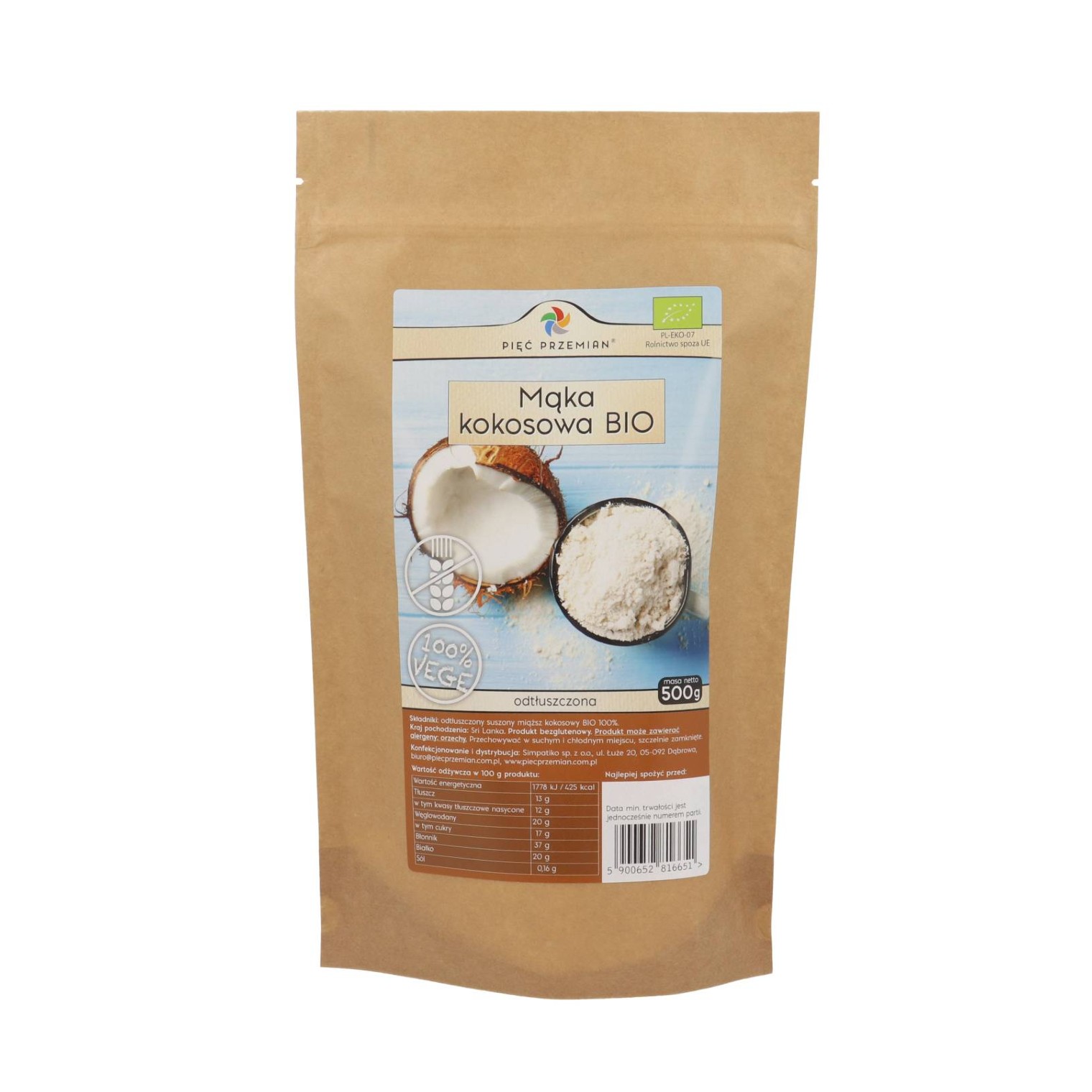 Mąka Kokosowa BIO marki Pięć Przemian to mąka kokosowa bezglutenowa pochodząca z certyfikowanych upraw. Uzyskiwana z miąższu kokosa jako produkt uboczny wytwarzania oleju i mleka kokosowego.