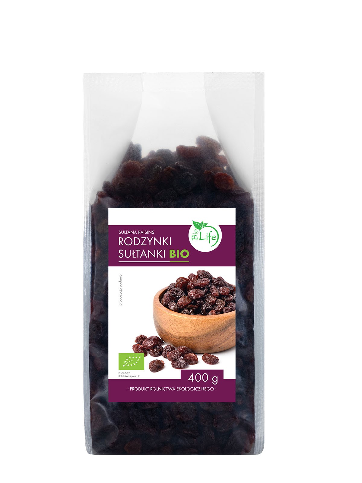 Ekologiczne rodzynki sułtanki to produkt suszony w sposób naturalny. Mogą być stosowane jako składnik deserów, sałatek oraz innych dań. Doskonałe również jako przekąska.