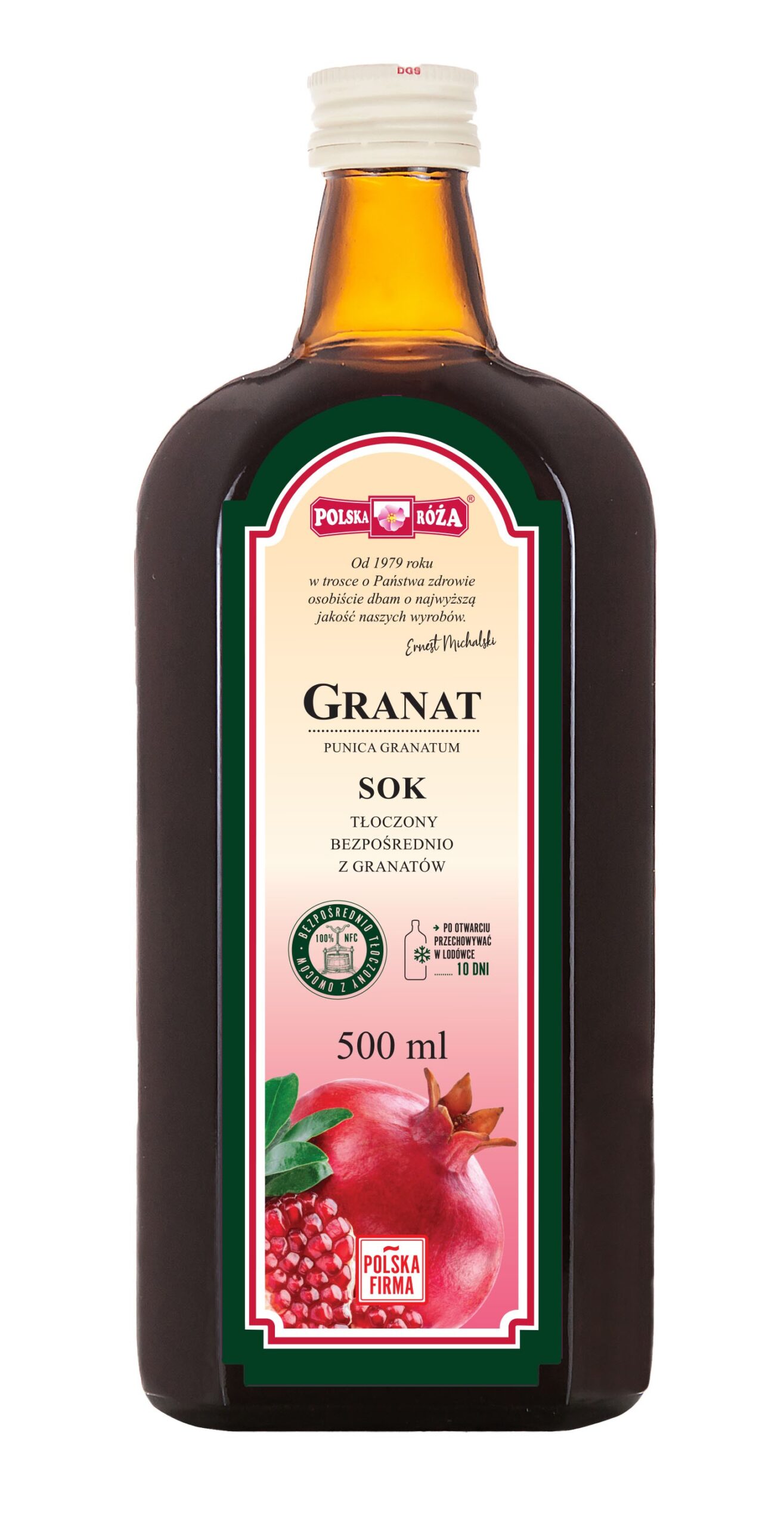 Stuprocentowy sok marki Polska Róża jest produkowany z dojrzałych granatów. Pozyskujemy go bezpośrednio z tłoczonych owoców, a nie z koncentratu Dzięki temu, napój cechuje się wyjątkową, czerwoną barwą i wyrazistym słodko-cierpkim smakiem. Doskonałe walory sensoryczne idą w parze z bogactwem witamin i wartości odżywczych – włączenie soku z granatów do codziennej diety dostarcza organizmowi sporą dawkę pozytywnej energii nawet w ponure dni.