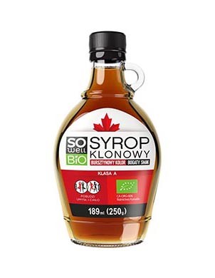 Syrop klonowy o bursztynowym kolorze i bogatym smaku.
