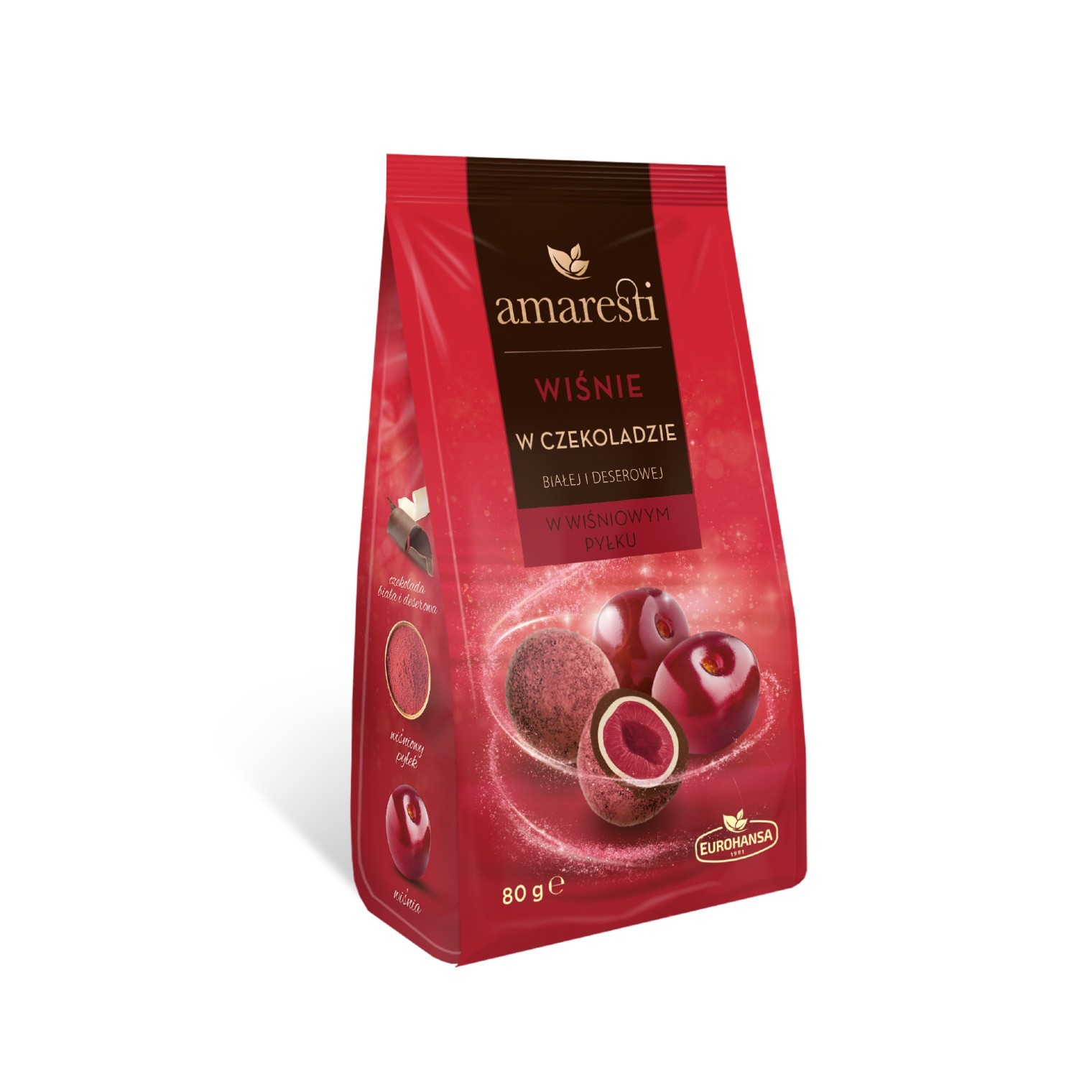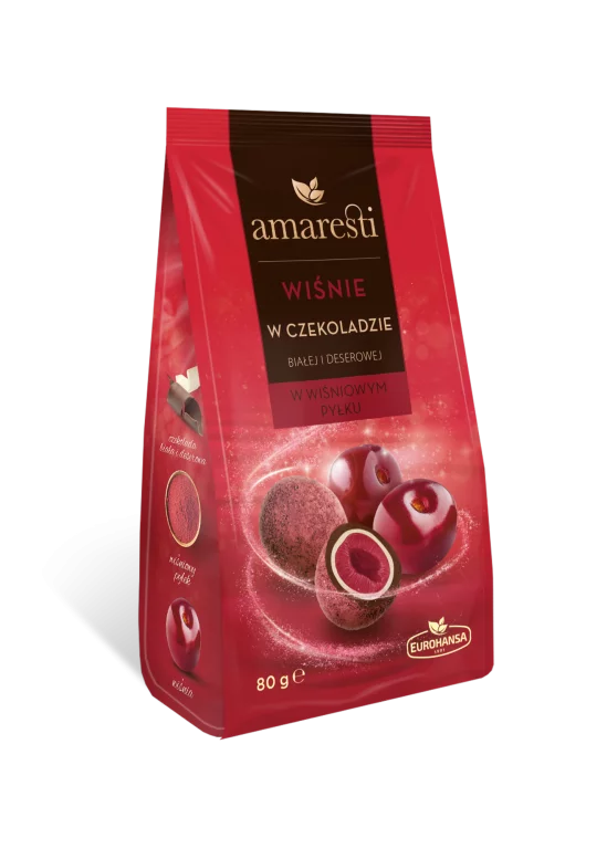 Soczysta wiśnia oblana została dwoma rodzajami czekolady: wewnątrz słodką białą i na wierzchu aromatyczną deserową czekoladą. Całość otulona jest delikatnym wiśniowym pyłkiem, który podkreśla smak produktu i nadaje mu wyjątkowego szlachetnego koloru.